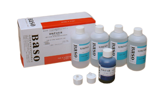 Blood cell staining: Erythrocyte appears vermeil. Leukocyte appears varying shades of blue to dark blue. Structure of nuclei is clear.Cytoplasmic granules are stained clearly and appear the specific color of each cell.