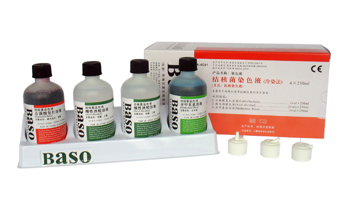 This staining kit is based on the Ziehl-Neelsen stain (a carbofulfuchsin solution) recommended by the WHO. Acid-fast bacteria such as Mycobacterium tuberculosis and Mycobacterium leprae are difficult to stain because of their lipoid capsule in the cell wall. However, once the lipoid capsule is stained with an enhanced dye such as carbolfuchsin, the newly formed compound will resist decolorization from acid-alcohol and retain the original color stained (red), which can be easily differentiated from other microorganisms that still adsorb the counter blue stain.