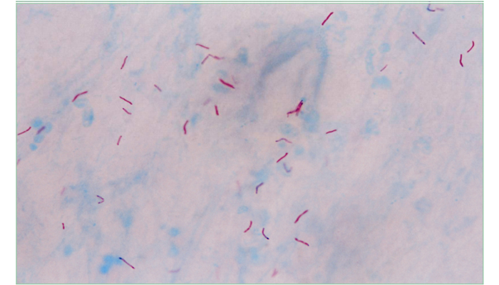 Acid-fast Mycobacterium species will appear bright red, while other bacteria and cells will be blue.