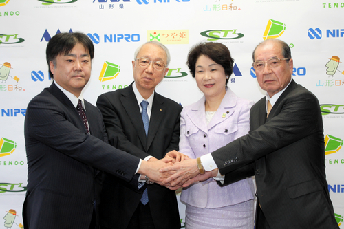 ↑宣告山形工廠即將開始建設(shè)建設(shè)、正在握手的(由左開始)伊藤社長(zhǎng)、佐野嘉彥NIPRO社長(zhǎng)、吉村美榮子縣長(zhǎng)、山本信治天童市長(zhǎng)