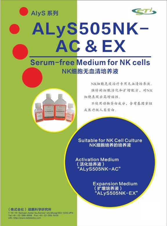 【產(chǎn)品概述】ALyS505NK-AC/EX 無(wú)血清細(xì)胞培養(yǎng)基是專為細(xì)胞免疫治療研究而開發(fā),培養(yǎng)基以改良的IMDM 為基礎(chǔ),含有重組胰島素、轉(zhuǎn)鐵蛋白、白蛋白等營(yíng)養(yǎng)物質(zhì),添加蛋白均為基因重組或者人類醫(yī)療級(jí)蛋白,培養(yǎng)基不含有任何動(dòng)物蛋白成分,表現(xiàn)出對(duì)人類外周單個(gè)核細(xì)胞高增殖性,更有利于NK 細(xì)胞活化及擴(kuò)增的無(wú)血清細(xì)胞培養(yǎng)基。