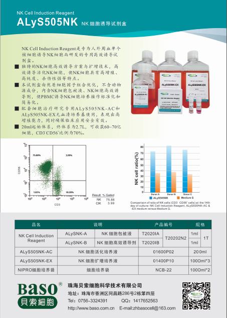 【產(chǎn)品概述】本產(chǎn)品是專為NK細(xì)胞高效活化誘導(dǎo)而設(shè)計的新一代(3.0A)NK細(xì)胞培養(yǎng)試劑盒,由ALySNK-A Reagent和ALySNK-B Reagent組成,含有優(yōu)質(zhì)級細(xì)胞因子及醫(yī)療級重組蛋白,不含動物源成分,可高效誘導(dǎo)人外周血NK細(xì)胞。本試劑盒需配套ALyS505NK-AC/EX無血清培養(yǎng)基使用,可提高細(xì)胞增殖倍數(shù)、NK細(xì)胞純度和殺瘤活性,同時使NK細(xì)胞培養(yǎng)操作標(biāo)準(zhǔn)化和簡易化。